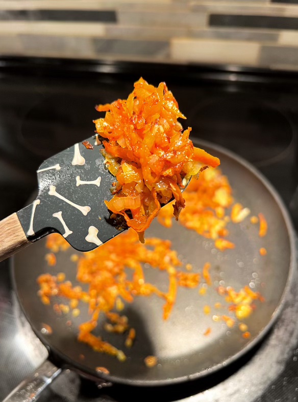 Once everything is caramelizing, add your garlic and cook for 30-60 seconds. Make sure you are constantly stirring, so that the garlic does not burn.