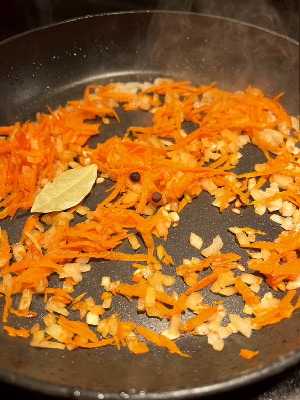 - Add your diced onions to the warmed up pan oil. Sauté for a couple of minutes until your onion begins to turn slightly opaque/clear or browned, then add your grated carrots, bay leaves and allspice berries and mix. Sauté until onions and carrots begin to caramelize and develop a golden color.
