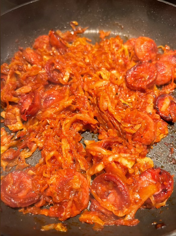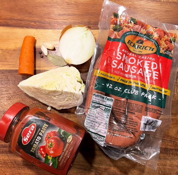 - Once your cabbage has gotten a bit browned, add your tomato paste and make sure to stir it all in and allow a few minutes to caramelize as well. This will help everything develop a natural sweetness. After a couple of minutes, add your cooked smoked sausage back into the pan with the rest of the ingredients and add 1/2 cup of water. Mix and cover with a lid and allow to stew for 5 minutes.