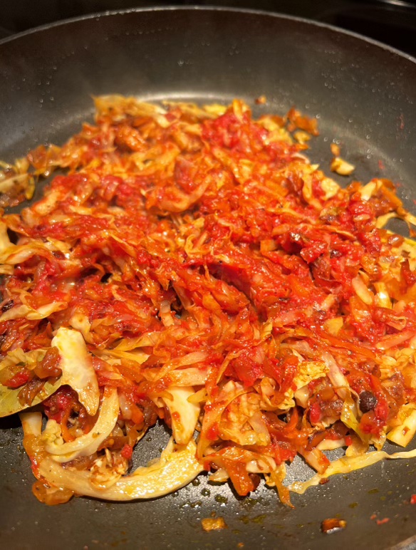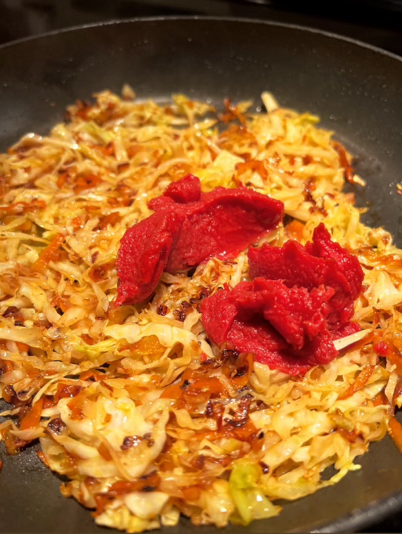 Once your cabbage is browned, add your tomato paste and incorporate it fully.