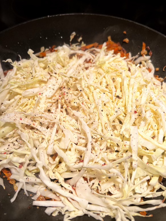 Add your cabbage, salt and pepper and mix. Cook until cabbage begins to develop a nice golden brown color.