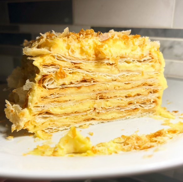 This cake is best served after sitting in the fridge overnight to allow your pastry layers to soften from the cream layers being incorporated into the dough.