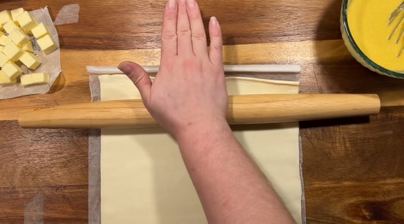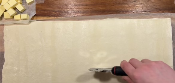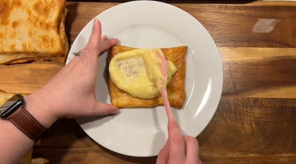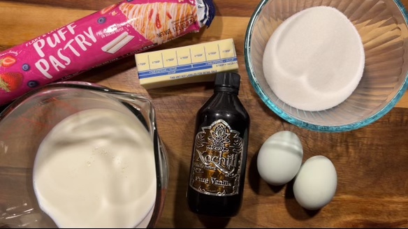 While your milk is preheating, preheat your oven to the temp that is recommended on your puff pastry packaging. Slightly roll your puff pastry sheet out thinner than it comes.