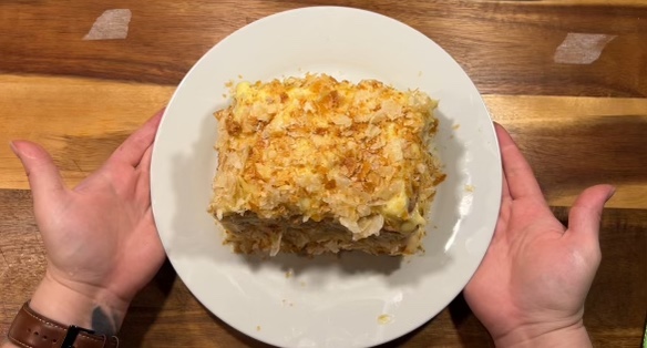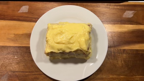 - Once your cream cools down to a manageable degree (or even in the fridge overnight!) you can begin your assembly. Your bottom layer should be puff pastry, topped with cream, then puff pastry and top with cream. Continue on until you are out of puff pastry pieces AND DONT FORGET TO RESERVE 1-2 pieces of pastry on the side. As you’re finishing your assembly, your top most layer now should be cream. Go all the way around and coat the sides with your cream as well. It should resemble something like a block of butter.