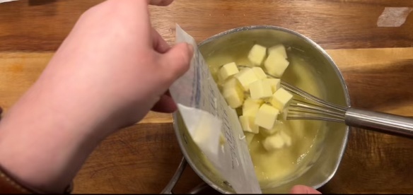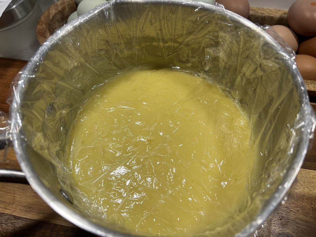 - Once your milk and sugar-egg mixture is fully incorporated and thickened, remove from the stove top and set aside for a few minutes. After a few minutes of letting it very slightly cool down, add in your butter and whisk everything again. Allow to cool for a little bit and then cover with Saran Wrap, making sure your Saran Wrap is TOUCHING the cream. This prevents film layer forming at the top as it cools down further.