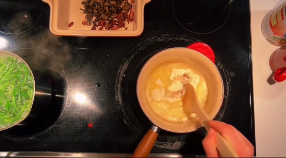 Melt your butter in the sauce pot whilst simultaneously par-cooking your green beans in a separate pot on another burner. After your butter is melted, add in your flour, stir, and cook until your roux develops a golden caramel color.