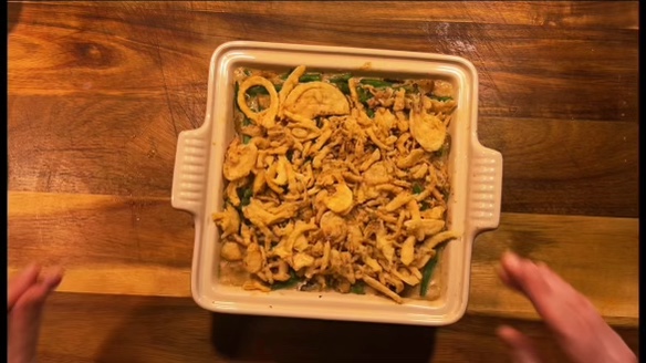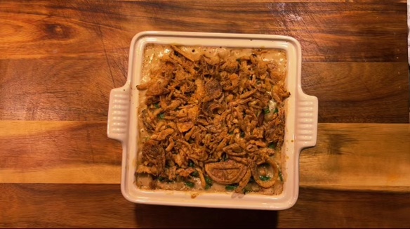 Once the initial 10 minute baking time is done, top with the other half of the container of fried onions and put it back into your 385 degree F oven for an additional 10 minutes.