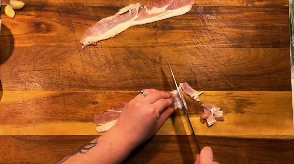 - Preheat your oven to 385 degrees Fahrenheit. Slice your bacon slices into small 1 centimeter big pieces and toss into a medium-hot sauce pot. Cook, stirring continuously, until bacon is browned.