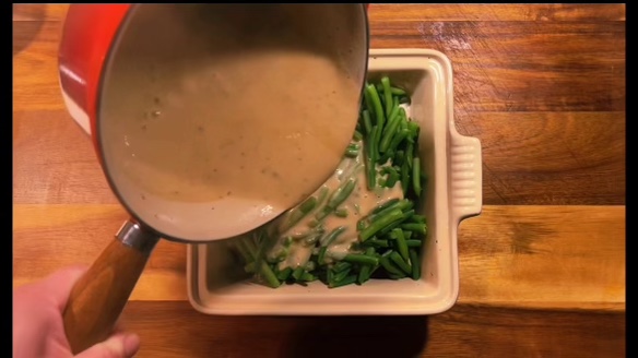 Once your sauce is thickened, it is now a béchamel, and you can pour it over your green beans in the casserole dish.