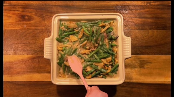 - Once your sauce is thickened, pour it right over your green beans, bacon and mushroom in the casserole dish. Mix everything together and add half your container of fried onions and mix again until everything is evenly distributed.