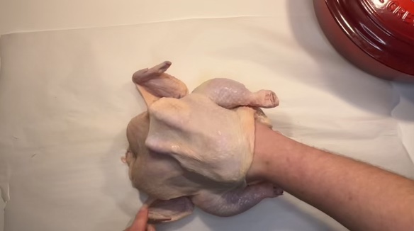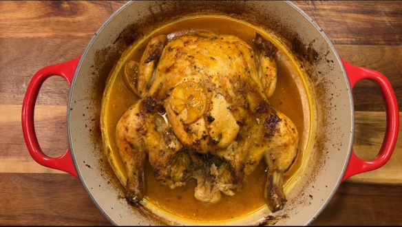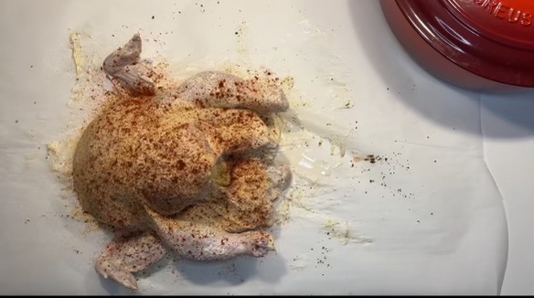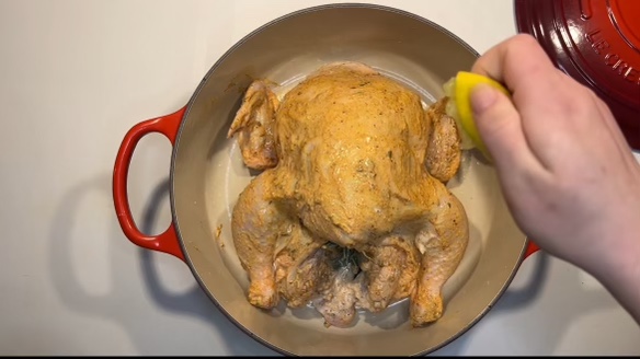- Once you’re done rubbing in your seasoned mayonnaise all over your chicken, go ahead and squeeze some lemon juice inside the chicken cavity and transfer the chicken to your baking apparatus. Squeeze the rest of your lemon(s) along the top of your chicken coat. You can then just toss your lemons halves straight into the pan with your chicken. I like using a dutch oven for this. You will need something with a lid OR you can top your pan with aluminum foil for the initial hour cook time. This will prevent your chicken from burning.