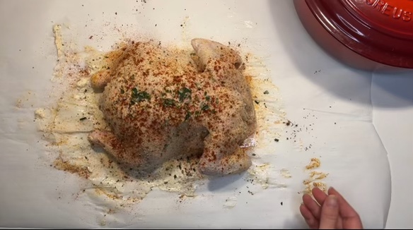 Make sure you season your chicken all over. Front, back, sides and inside the cavity. Add your chopped herbs at this time as well. Add your mayonnaise at this time and use your hands to fully coat the chicken in the seasonings and mayo mixture all over.