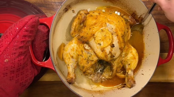 After your initial one hour cooking time, remove your lid and baste your chicken with the juices that are inside the pan. Then proceed cooking your chicken, uncovered, until the internal temperature reaches 165 degrees Fahrenheit or higher. Baste your chicken every 10-15 minutes during uncovered cooking time. This will prevent the skin and outer part of the meat from burning and drying out.