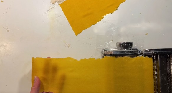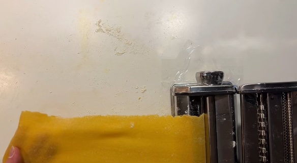Using a pasta machine, roll your dough out from the thickest level (typically level 1), passing through one time on each level, until level 6 or 7. I find that level 7 is my preferred thickness for pasta.