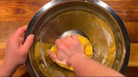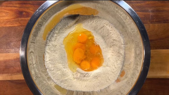 - Make a well in your mixed flours and add your eggs and oil. Using a fork or whisk, mix your eggs up and begin combining them with your flours. Keep folding the dough in on itself until it is fully incorporated, yellow in color, and begins to form a ball. This may take 6-10 minutes of mixing by hand. You can use a stand mixer with a dough hook attachment as well, although, I have never personally tried that.