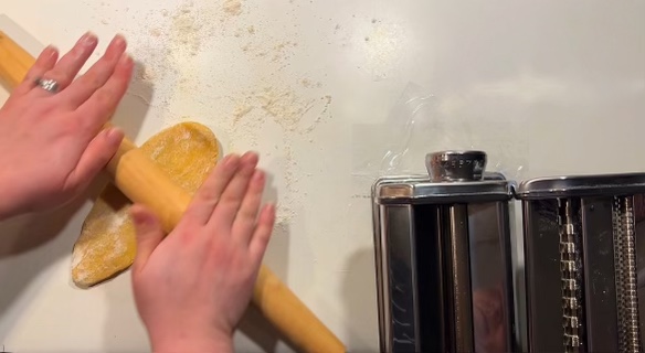 - Flatten your pasta dough piece with your hands and cover both sides with flour. Use a rolling pin to slightly roll it out so that it is able to fit into your pasta roller machine. If you do not have a pasta machine, and prefer to do this all by hand, then continue using a rolling pin to roll your pasta dough piece into your desired thickness.