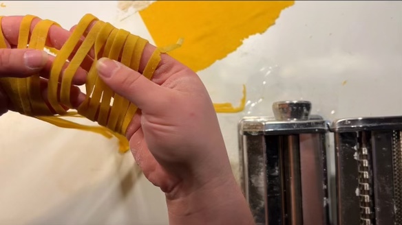 Once you roll out to your preferred thickness, feed your pasta sheet through a pasta cutter, like the fettuccini cutter in the photo above.