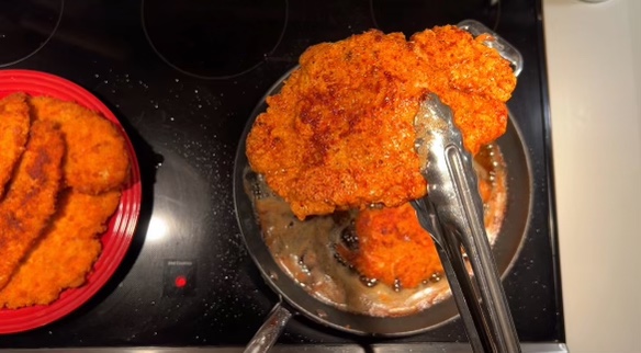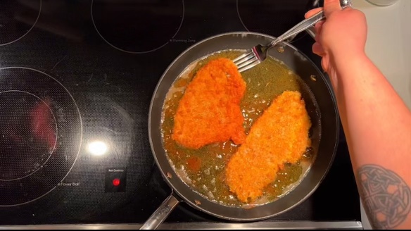 - Coat your thin meat slice in seasoned flour, then dip into your egg mixture, then lay on your breadcrumbs and coat both sides. Lay directly into your warmed up oil and pan fry until golden. This typically takes 3-4 minutes per side. Remove from oil and set on paper towels to drain excess oil, or just put on a plate!