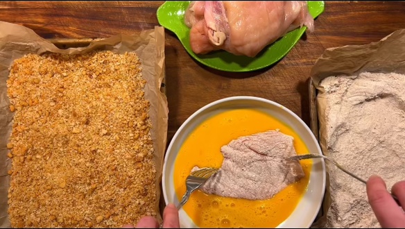 Coat your thin meat slices in your seasoned flour, then dip into your egg mixture, then coat in your breadcrumbs.