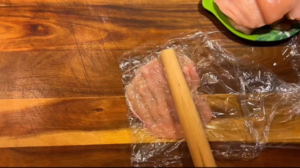 - Either purchase pre-sliced thin chicken breasts OR cut regular sized breasts into 3 thin slices each. Use a meat tenderizer or rolling pin to pound each meat slice very thin. Be careful not to over beat your meat, 😉 , otherwise it will break apart when you’re breading it. Begin heating your oil up in your pan over medium to medium-high heat.