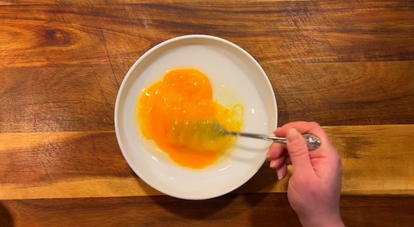 In a bowl, mix together your eggs. This will act as your glue in between breading stations.