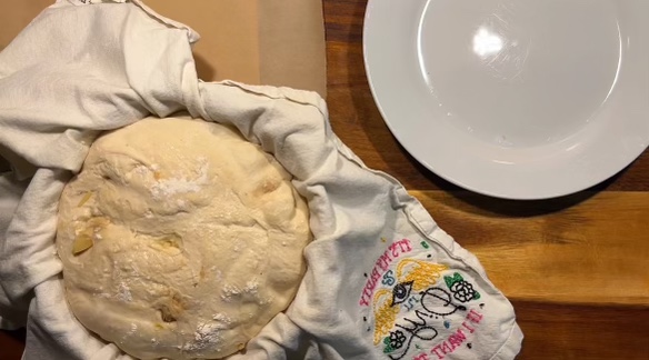 After your second rise/ferment, you will transfer your dough from the towel bowl to a piece of parchment paper you will be baking it on. Preheat your ovens and dutch ovens/cooking apparatuses, during this time, to 450° F.