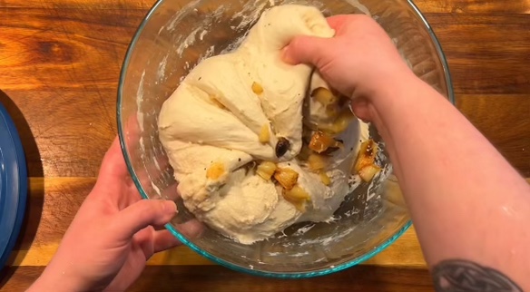 - FOR INCLUSION LOAFS : Add your inclusions (in this case, your roasted garlic) during your second stretch and fold. You can make a small well in the middle of the dough and add your inclusions there and then proceed with the stretch and folds and all other instructions as outlined in the master base recipe and below. — Lift one edge, any edge, of your dough and pull it upward roughly about 12″ and then press it into itself, in the center. Repeat on the edge next to the one you just pulled up. Continue this along the entire bowl until you do 2 full circles around. This completes your second stretch and fold. Cover with a lid or towel and let rest 30 minutes.